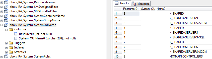 Mijn probleem zit 'm in v_RA_System_SystemOUName.System_OU_Name0: die geeft niet de OU van het object weer maar de hele tree. Voor een gegeven machine X krijg ik het volgende terug (fictieve gegevens):