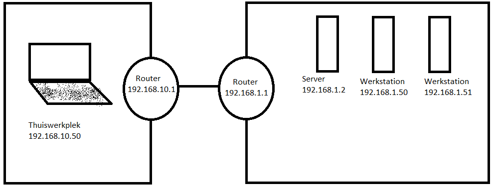 Ik moet voor school een VPN verbinding opzetten in 2 verschillende netwerken, nouja dit is meestal met 2 verschillende netwerken... dit is allemaal een opdracht voor mijn eind examen ICT niveau 4. Nou wil ik dit eerst thuis proberen om te kijken of het werk. Ik heb nu 2 routers thuis, Alle apparaten behalve mijn vaste PC/vpn host/server zitten in het 192.168.1.1 netwerk. mijn vaste pc zit in het 192.168.10.1 netwerk.