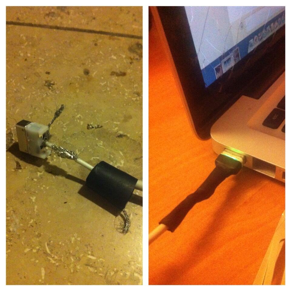 Nou doet vandaag het volgende zich voor, ik zie dat mijn MagSafe niet oplaad dus, ga wat aan het draadje 'wigglen' om hem zo te laten opladen. Dat lukt een paar keer, maar voor minder dan 2 minuten. Daarna gaat hij weer uit. Ondertussen is de het begin (waar het draadje uitkomt vanaf de lader) zo warm geworden, dat ik hem eruit moest halen. Na een paar minuten er weer in gestopt en na 2 minuten kwam er rook uit het begin van het draadje af. Blijk hij zijn doorgebrand! Lekker dan! Ondertussen maar even een MagSafe van een collega 'geleend'. Overigens kreeg ik geen garantie op mijn lader, omdat hij ouder is dan 1 jaar. Net 1 jaar en 2 weken.