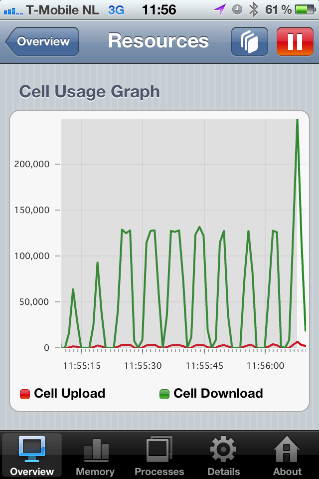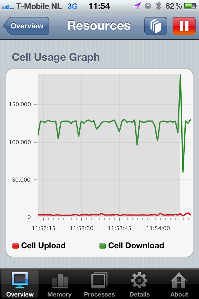 Als ik de network usage van de iphone bekijk zie ik wel een mooie constante lijn.