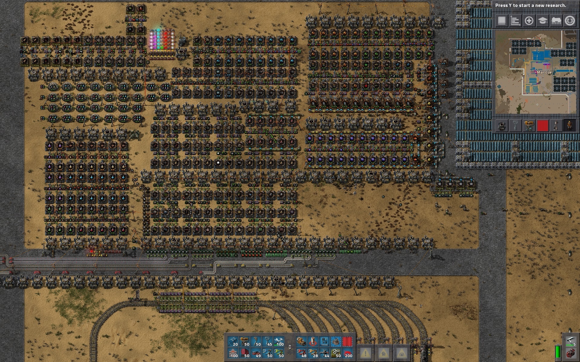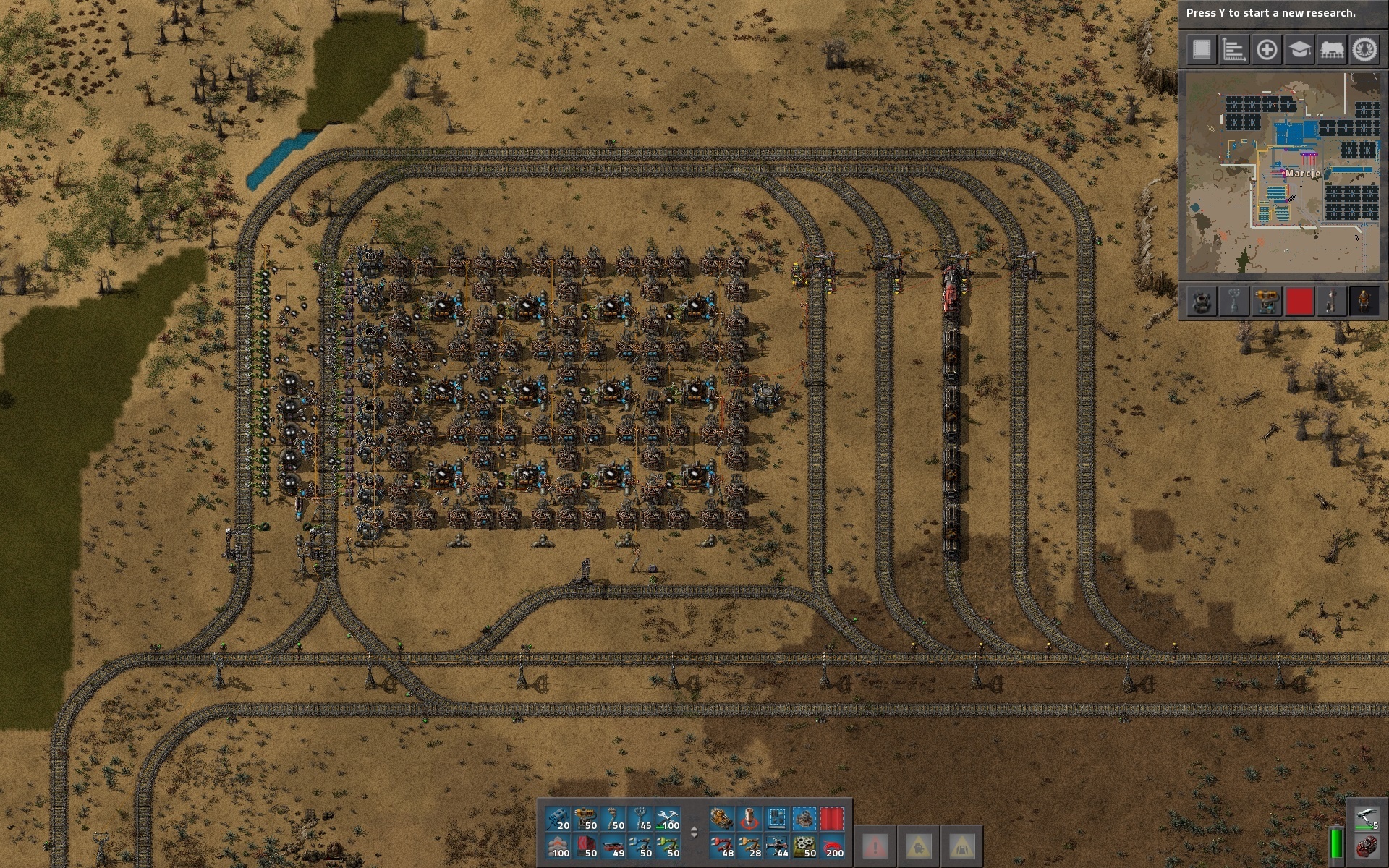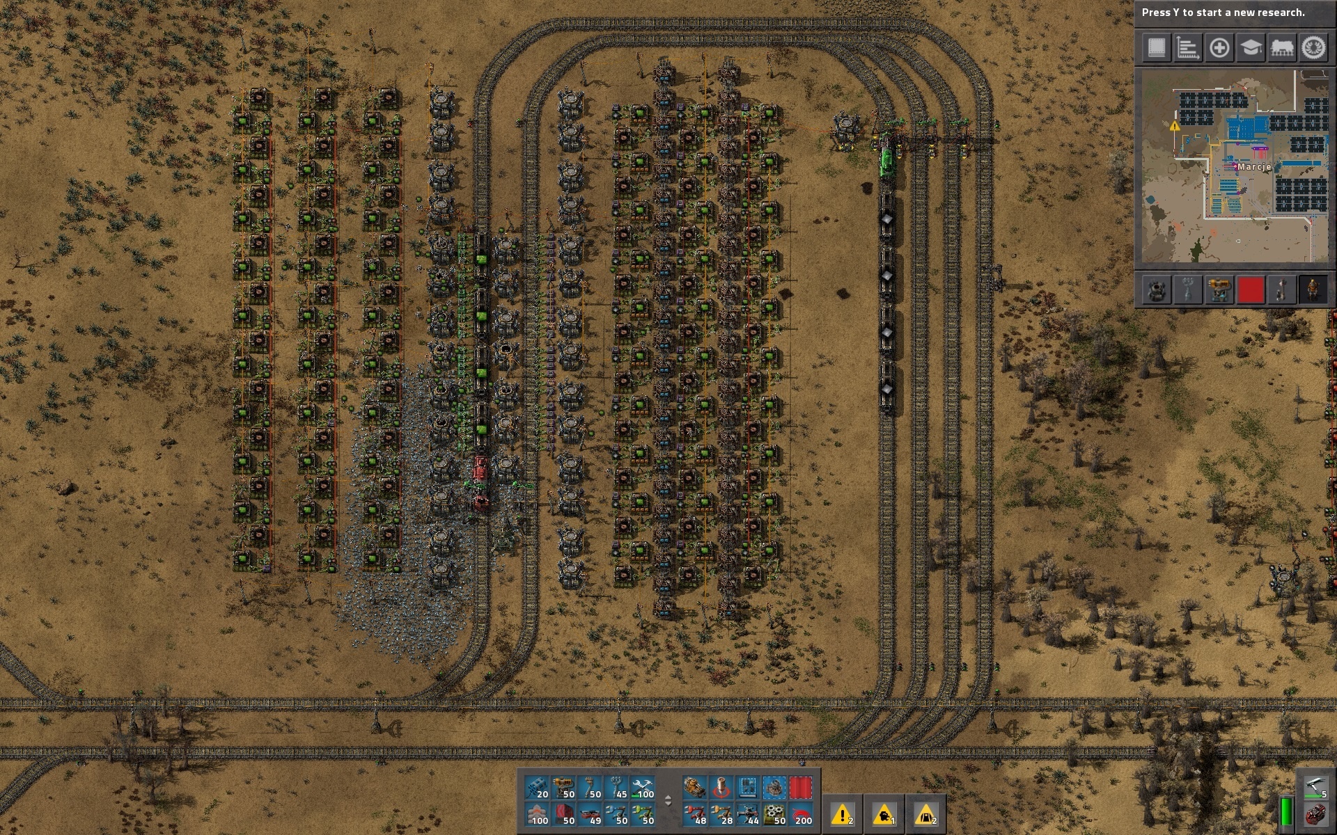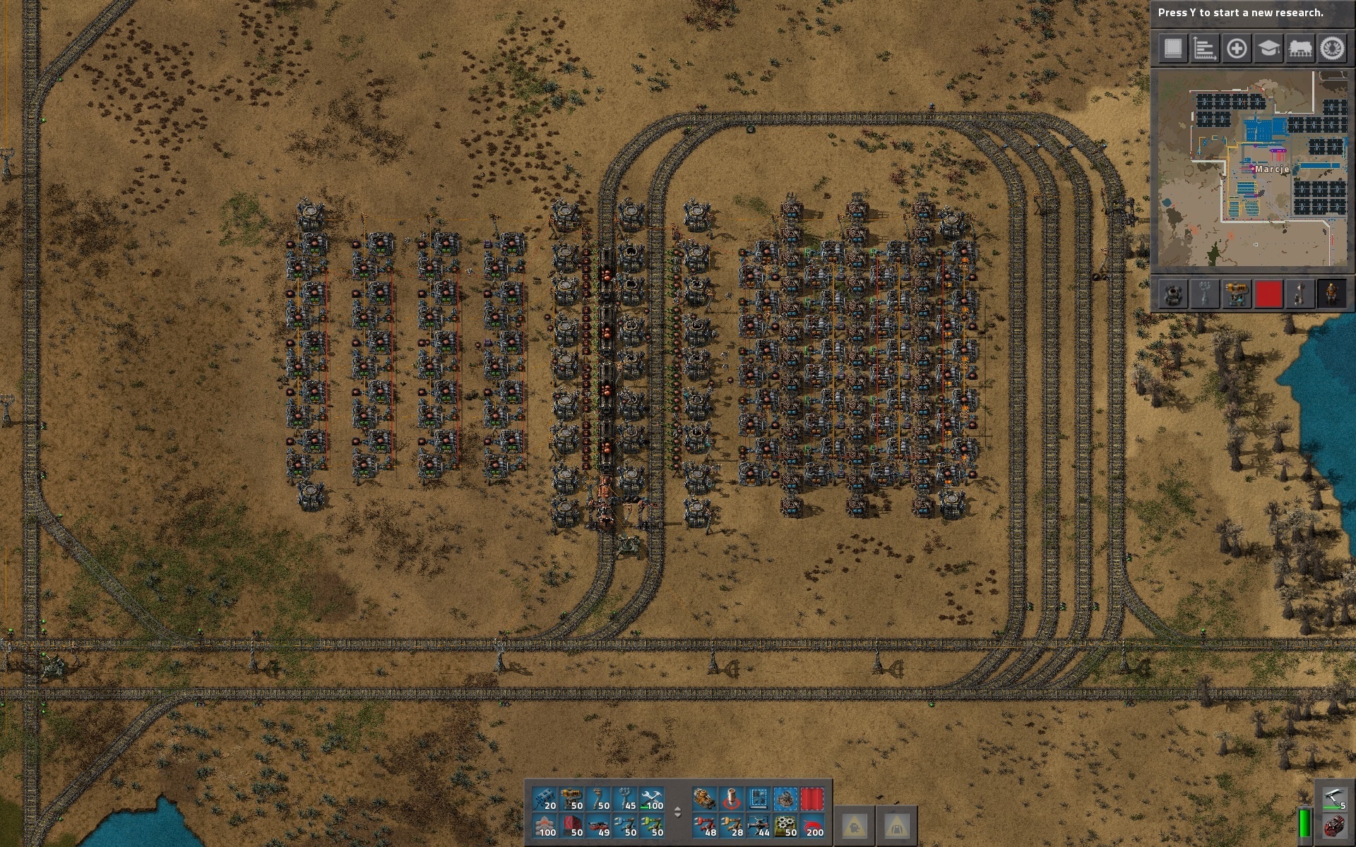 De eerste ijzerplaten-hub is net klaar (geïsoleerd drone gebied), er is wachtruimte voor 18 treinen, er zijn 10 stations om te lossen, en na elk station is er ruimte voor 1 trein om te wachten tot de seinen op groen springen. Daaronder is voor het laden van ijzer hetzelfde gedaan (18+10). Elk station heeft ruimte voor 4locs+8wagons.Aantal stack inserters: 2*10*8*2*6 = 1920 stack inserters; gezien de beperkte productiecapaciteit van mijn hoofdbasis heeft dit een aardige tijd gekost