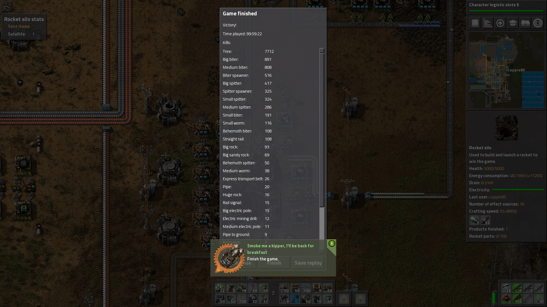 (ik weet nog dat alien ergens smelters bouwde, dan oppeens random x seconden naar rechts liep, en daaar verder ging. anderhalf uur later bleek dat echt precies de 30 tiles te zijn die nodig waren voor een rocket controleer fabriek oid. ) Dus ook 2 x zo snel is al een behoorlijke achievement !