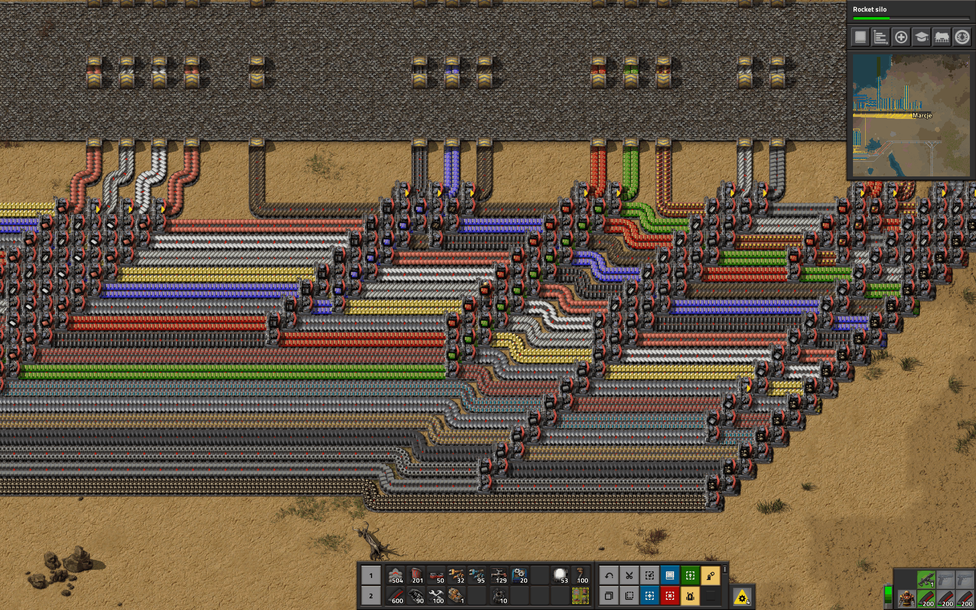 Hier mijn LDS module. In totaal 32 green assemblers met elk 4 prod3 modules, en elke assembler is verbonden met 8 beacons met ieder 2x speed3. Dit produceert zo'n 740 items/minuut, goed voor 1 rocket + 1 satellite. Voor Steel gebruik ik maar 4 wagons ipv 8, maar omdat er eerst dus Red Circuits werden aangevoerd heb ik het design maar gelaten voor wat het is, vandaar dat voor Steel maar de helft van de belts gebruikt worden. Maakt ook niet zoveel uit, uiteindelijk heb ik maar 2 belts aan plastic+steel nodig. Rechtsonderin zie je het noodstation voor Red Circuits