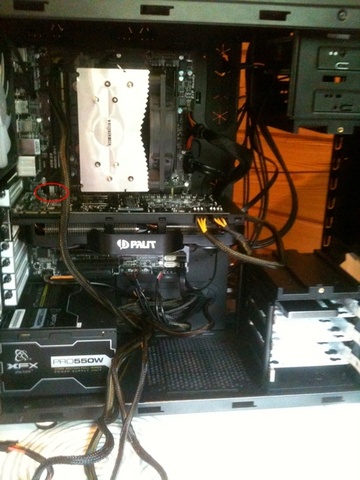 Links van de CPU koeler loopt een voedingskabel naar het moederbord. Ik heb geprobeerd om deze via de achterkant te leiden en dan in het moederbord proppen maar de kabel is net te kort