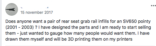 Die mirror extender stelt inderdaad niet zoveel voor en heb je zo geprint. Dit duurt iets langer, omdat er ook wat support nodig is. Het is dus een vrij specifiek motor onderdeel, maar schijnbaar is er vraag naar. Alleen niet zoveel in Europa aangezien ik er in het verleden maar een paar verkocht heb en het mij teveel moeite kostte (voor de tijd die ik erin moest steken en het geld dat het opleverde). Maar blijkbaar deden ze het in de UK vrij goed.