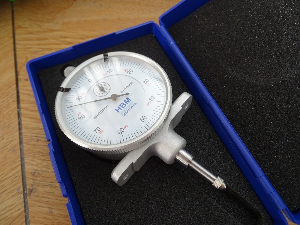 Voor het vlakzetten van mijn print oppervlak ten opzichte van mijn eind schakelaars heb ik een meetklokje waar ik een beugel voor gemaakt heb. De tafel staat nu binnen 0,05mm vlak, alleen laat het klokje ook keihard zien waarom de Rostock verder ontwikkeld is naar de Kossel... De lineair assen van 8mm veren door/weg tijdens het bewegen waardoor je toch vreemde waardes ziet bij een omkerende beweging. (Backlash) Bij een mini rostock zal dat wel een beetje meevallen, maar mijn assen zijn meer dan 800mm lang.