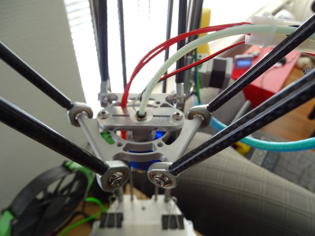 Het platform of end effector is ook uit aluminium gefreesd (en getekend in solidworks) maar de mount voor de hot end is nog de oude die ik snel passend gemaakt heb met een ijzerzaag.