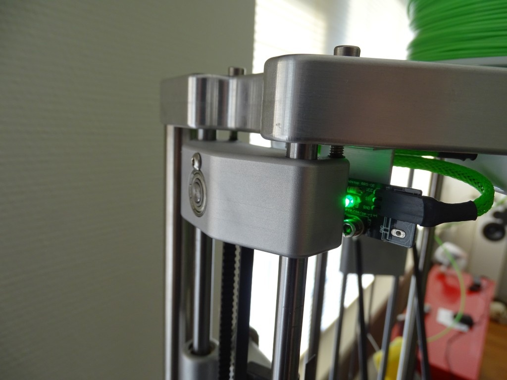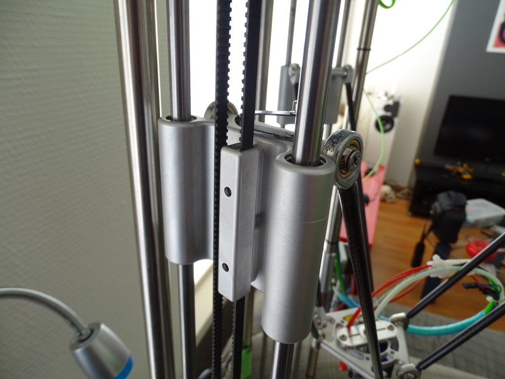 De laatste upgrade waren de idler ends. Tijdens het weer in bedrijf stellen van de rostock liep een snaar van het lager af, met als gevolg een hikkende stepper en iemand die de noodstop indrukt in repetier... Daar wou ik vanaf, net als het onhandige op spanning zetten van de snaar. Bij het originele ontwerp zaten de schroeven van onderaf door de idler end, en zat er schroefdraad in de bovenplaat. Dat heb ik omgedraaid zodat je van bovenaf de schroeven aan kan draaien, dat werkt prettiger. De snaar loopt over een dubbel gelagerde poelie die ik iets aangepast heb.