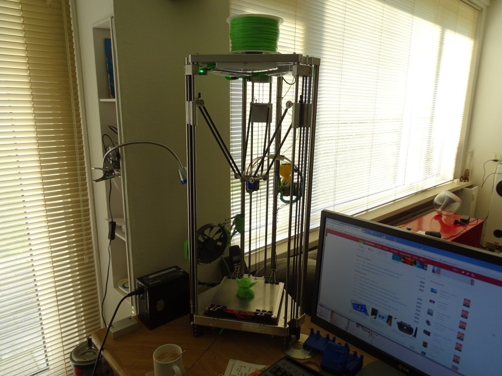 Zo staat mn printer er nu bij. Het frame heb ik anderhalf jaar terug al gemaakt toen ik nog bij een andere werkgever zat, en had toen nog voor een groot deel printed parts. Alleen stoorde ik me er aan dat het het allemaal net niet was. Of het ging snel stuk, of het was te slap. Na een reeks tegenslagen heb ik de printer een jaartje aan de kant gezet omdat ik er helemaal klaar mee was... Totdat ik in november begon bij mijn huidige werkgever, en wel mogelijkheden zag om nieuwe betere delen te maken.