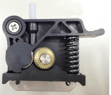 Ik weet niet precies wat je bedoelt, maar de extruder heeft één tandwieltje met smalle 'vinnen' om het filament naar erdoor te trekken en een soort katrol met een geul in het midden