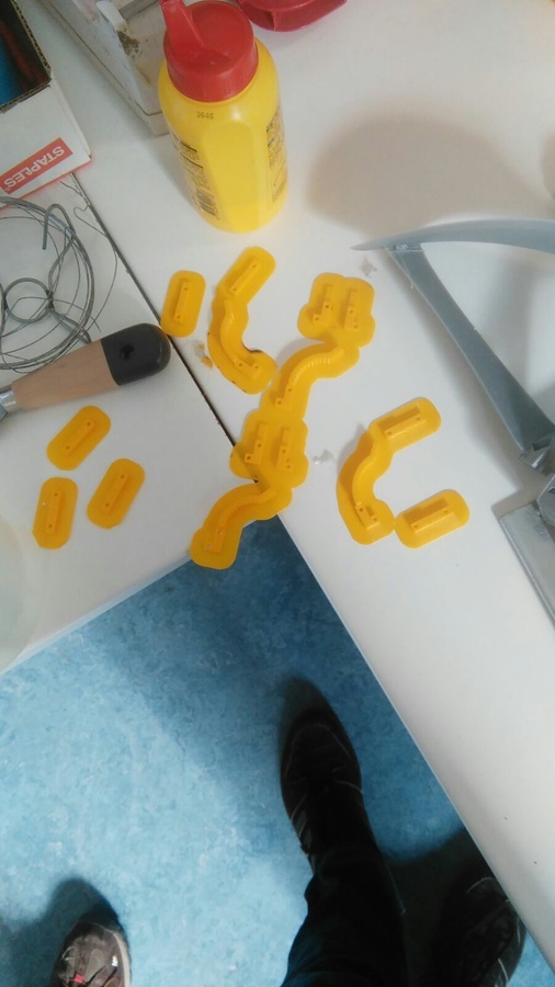 Op het Het lijkt erop dat in cura eigenlijk alles goed gaat. In sketchup zorg ik er altijd voor dat mijn volumes dicht zijn. Dus er zitten geen gaten meer in. We hebben de gaatjes 2 mm gemaakt. Later heb ik die iets uitgeboord tot 3 mm gaatjes waar een 3m boutje in past. Dat werkt prima. Staafjes bleven niet zitten. Daarom zo. Ik had die kleine dingetjes trouwens twee keer uitgeprint, dus even dubbel in een printopdracht, voor het geval er nog iets mee mis gaat, dan hebben we nog reserves.