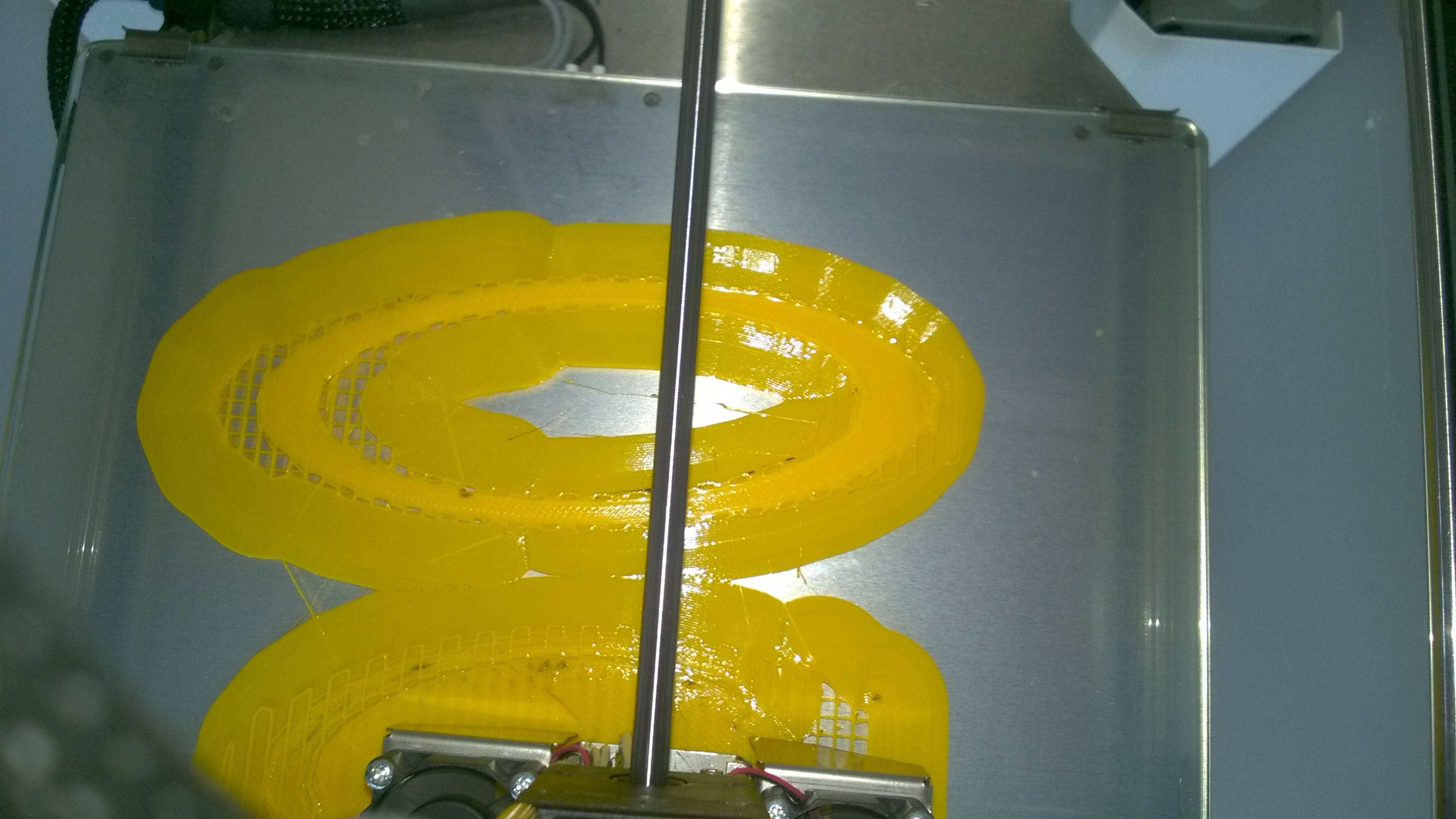 Dat hebben we gedaan. Ik hoorde net dat er een materiaalwissel is gedaan en hierbij bestaat de kans dat er PET is gebruikt op de het eerste gedeelte van PLA. Verder hebben we ook nog leuke dingen als hout, maar dat is allemaal niet nodig nu. Ik weet niet zeker welk materiaal er nu in zit, dat is dus of PLA of PET, we begonnen met PLA. Ik bekijk dit morgen even.