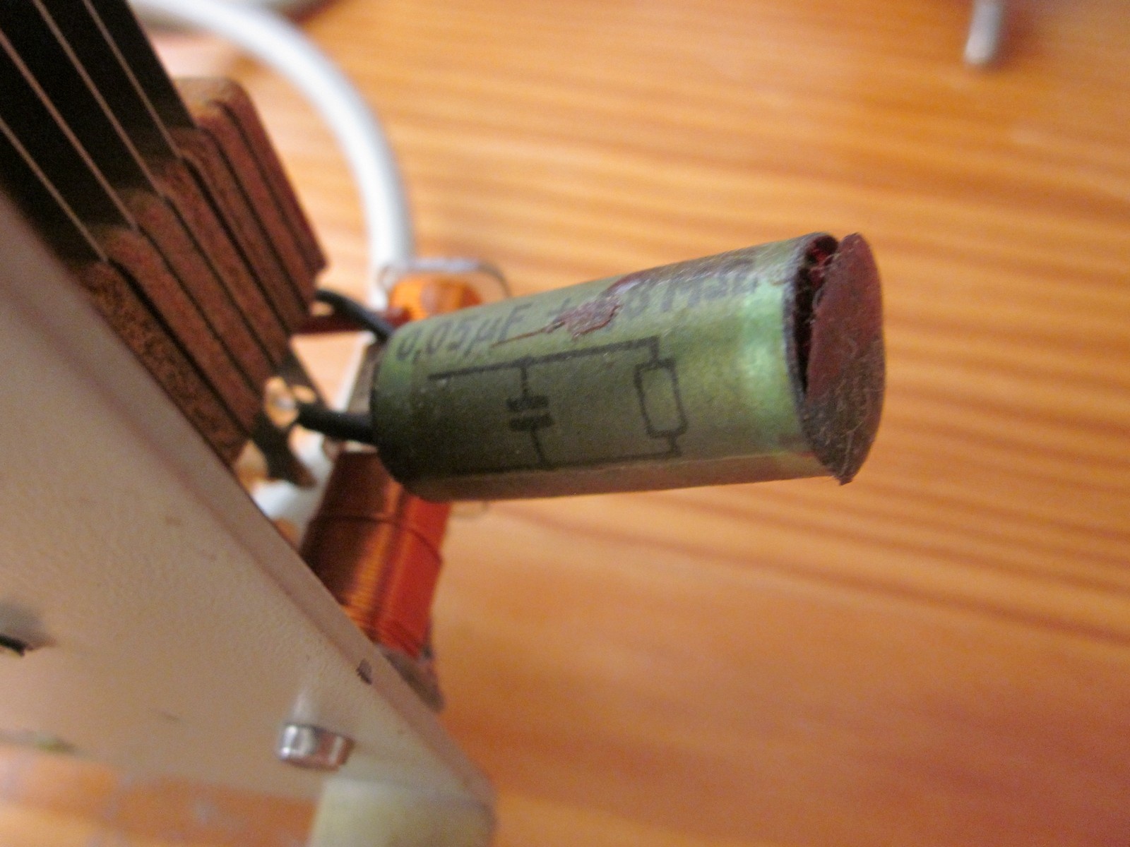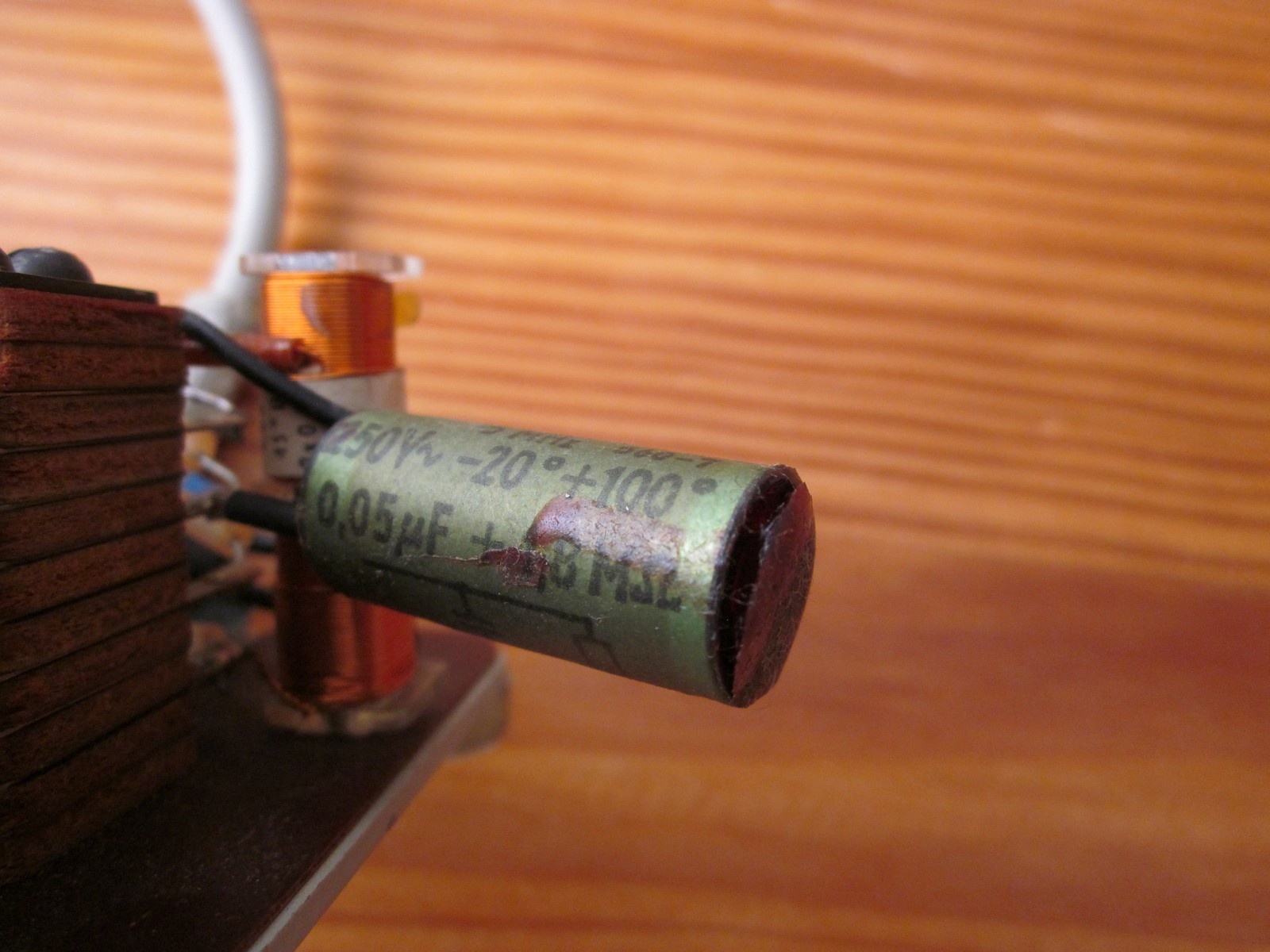 De ontstoringscondensator aan de transformator is vorige keer al kapot gegaan. Deze is toen vervangen door een kleiner model (0,02µF ipv 0,1µF) wegens de fysische beperkingen van de pedaal.