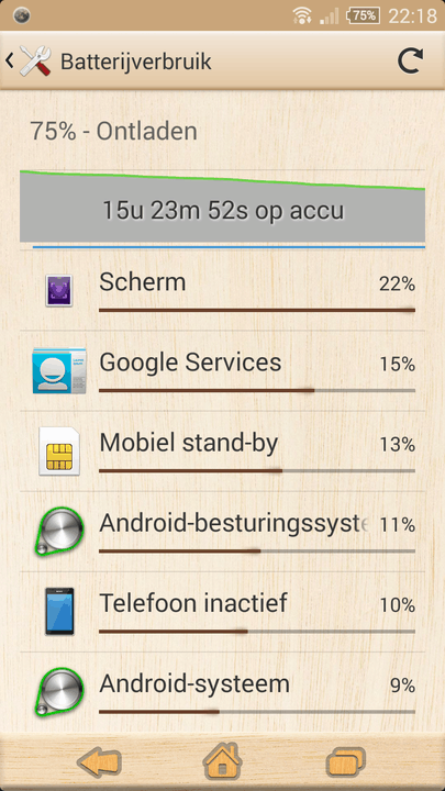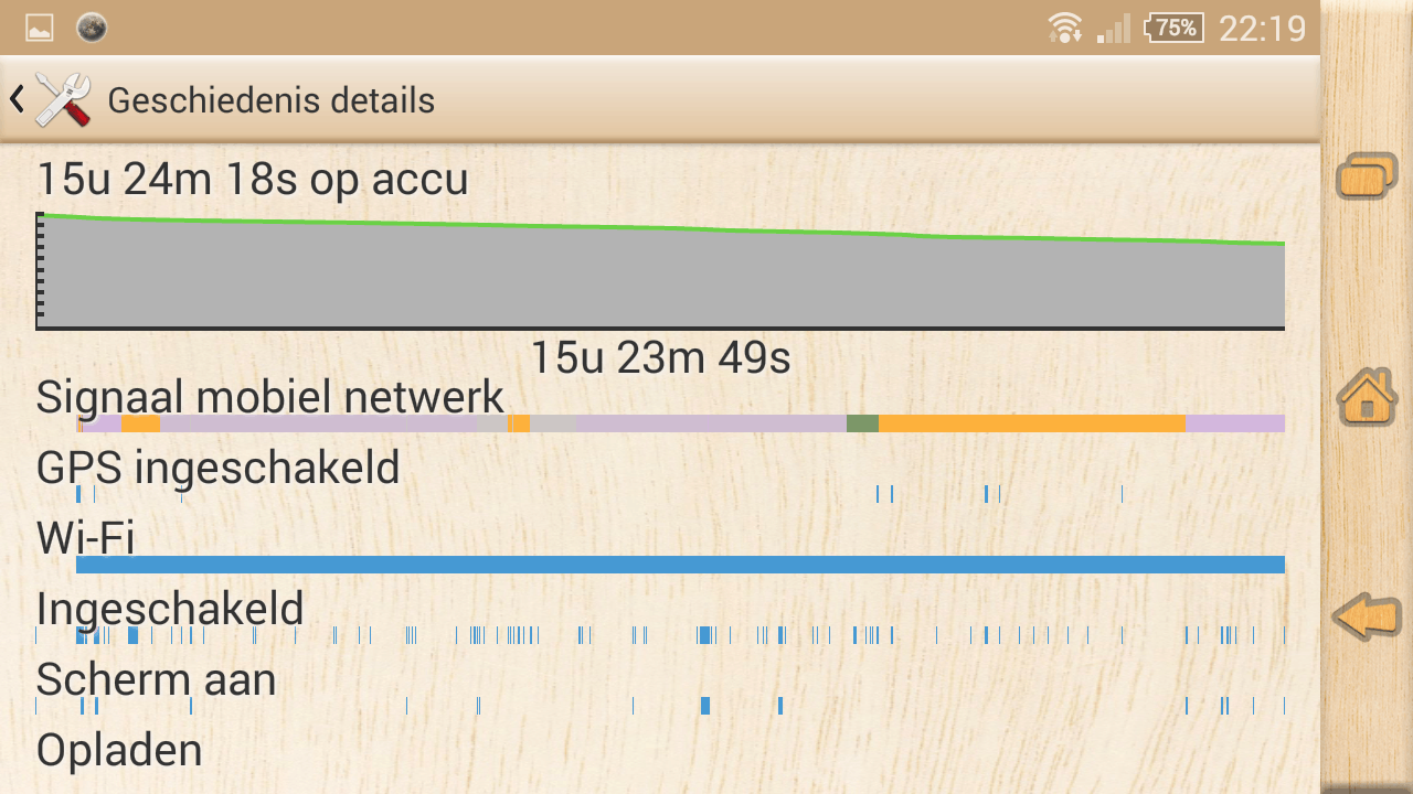 Voor de geinteresseerden, hier een paar screenshots van mijn batterijverbruik vandaag met 4.4.4 erop (vanochtend rond 07:00 van de lader gehaald).