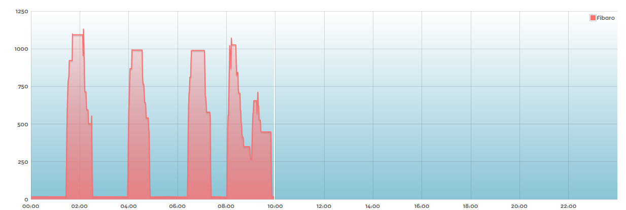 Je ziet dat de Elga vrijwel continu draait. Vermogen ligt dan rond de 360W (dus wel een stukkie hoger dan wat ik eerder zei, excuus). De stops zijn volgens mij niet echt nodig en ook ongewenst, maar dat heb je nou eenmaal met ruimte-T-afhankelijke regeling.