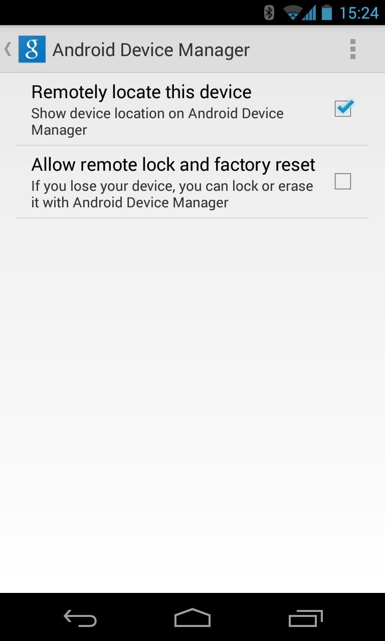 Dit zit al in android 4.3, zie ook het screenshopt van mijn nexus 4 met 4.3Zo is de Android Device Manager, waarmee gebruikers een telefoon op afstand kunnen wissen, in het Instellingen-menu gezet
