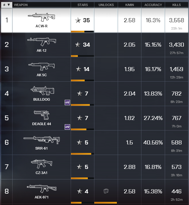 AEK ook een fijn wapen voor dichtbij. En ik kan niet achterblijven met mijn lijstje. Hij is wat langer dan de rest omdat ik net ben begonnen met de AEK. Ik zie dat mijn accuracy niet in de buurt komt van Gixxer. Waarschijnlijk schiet ik altijd ook al ligt het niet in mijn bereik. Ik heb nog wat te leren.