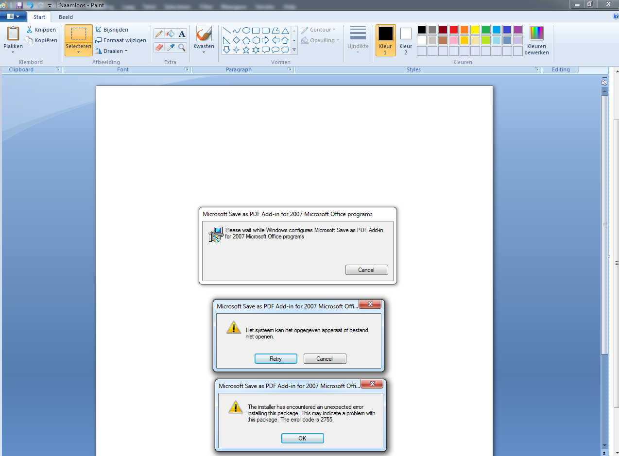 Het lukte me eerst niet om bestanden als PDF op te slaan en had ik een het bestand PDF-Add in for 2007 Microsoft Office programs gedownload, en daarmee wou het ook niet.