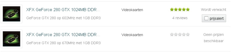 Bedoel je de melding 'Er zijn nog geen prijzen van de XFX GeForce 280 GTX 1024MB DDR3 Standard bekend. Stel een prijsalert in om bericht te krijgen zodra er een prijs bekend is.' op de prijzen tab?