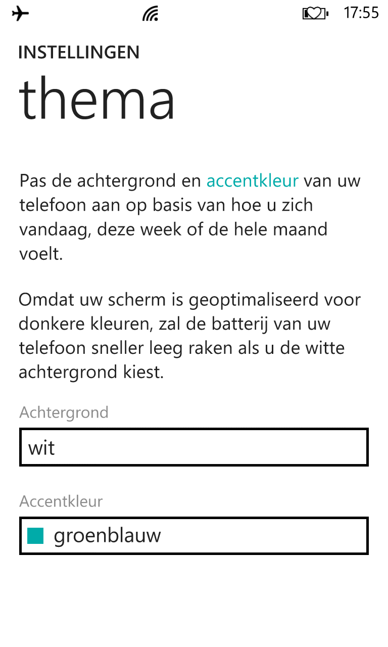 Hoewel Windows Phone uit de doos komt met een zwarte achtergrond kun je als gebruiker ervoor kiezen om deze wit te maken. Windows waarschuwt dan echter dan