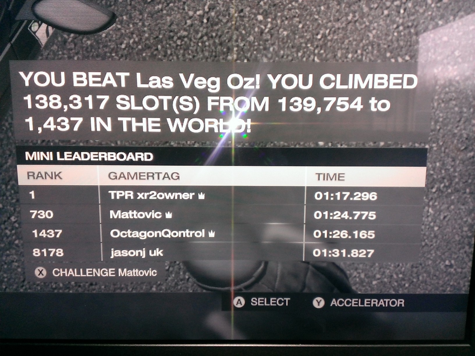 - Free Play: is wat lastiger maar pak de Indianapolis Oval race, een zo snel mogelijke auto (Mazda of Lotus raceauto), tune de laatste versnelling naar max (maximale snelheid) en probeer tegen zo moeilijk mogelijke drivatars en met zo min mogelijk assists 25 of meer rondjes te rijden en 1e te worden.