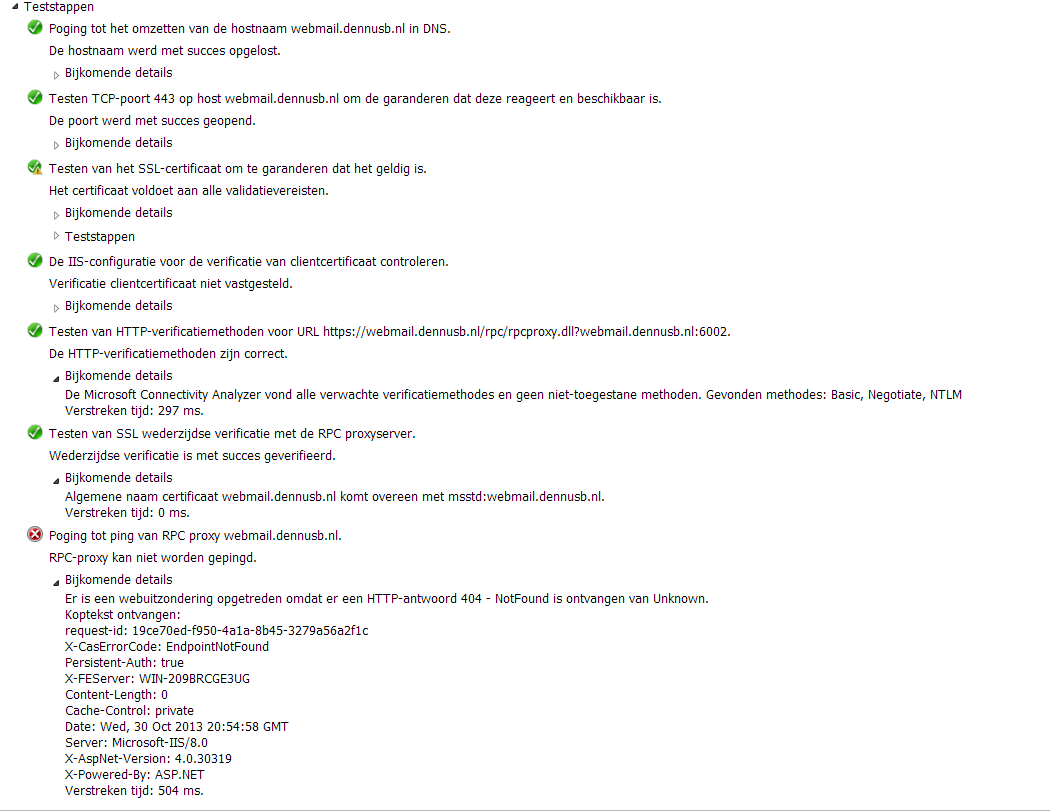 De mail, inkomend & uitgaand alsmede ActiveSync en IMAP werken prima. Nu wilde ik ook graag Outlook Anywhere aan de praat krijgen.
