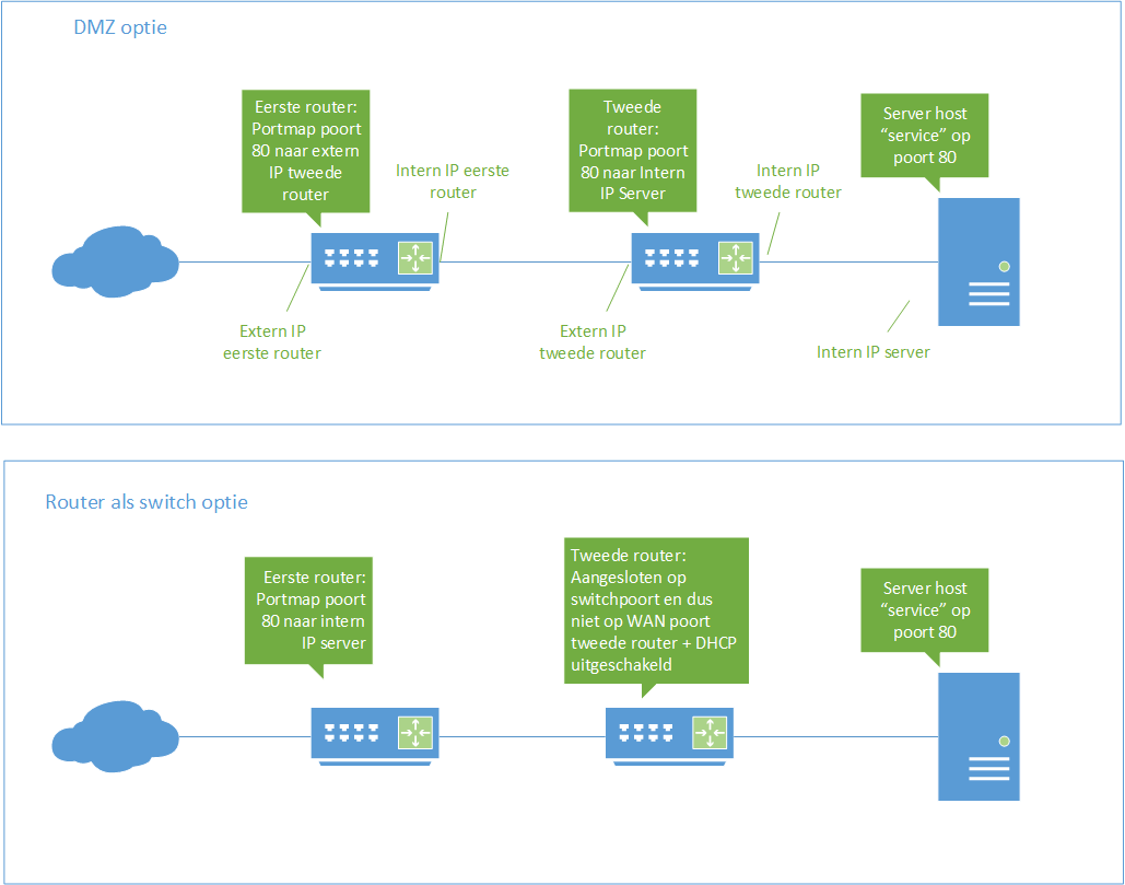 Ik heb een NAS Synology DSJ413 die boven aan een "2e router" is aangesloten. Nu zit het zo dat we beneden ook nog een modem/router hebben staan (die van de ISP dus, namelijk "Telenet").