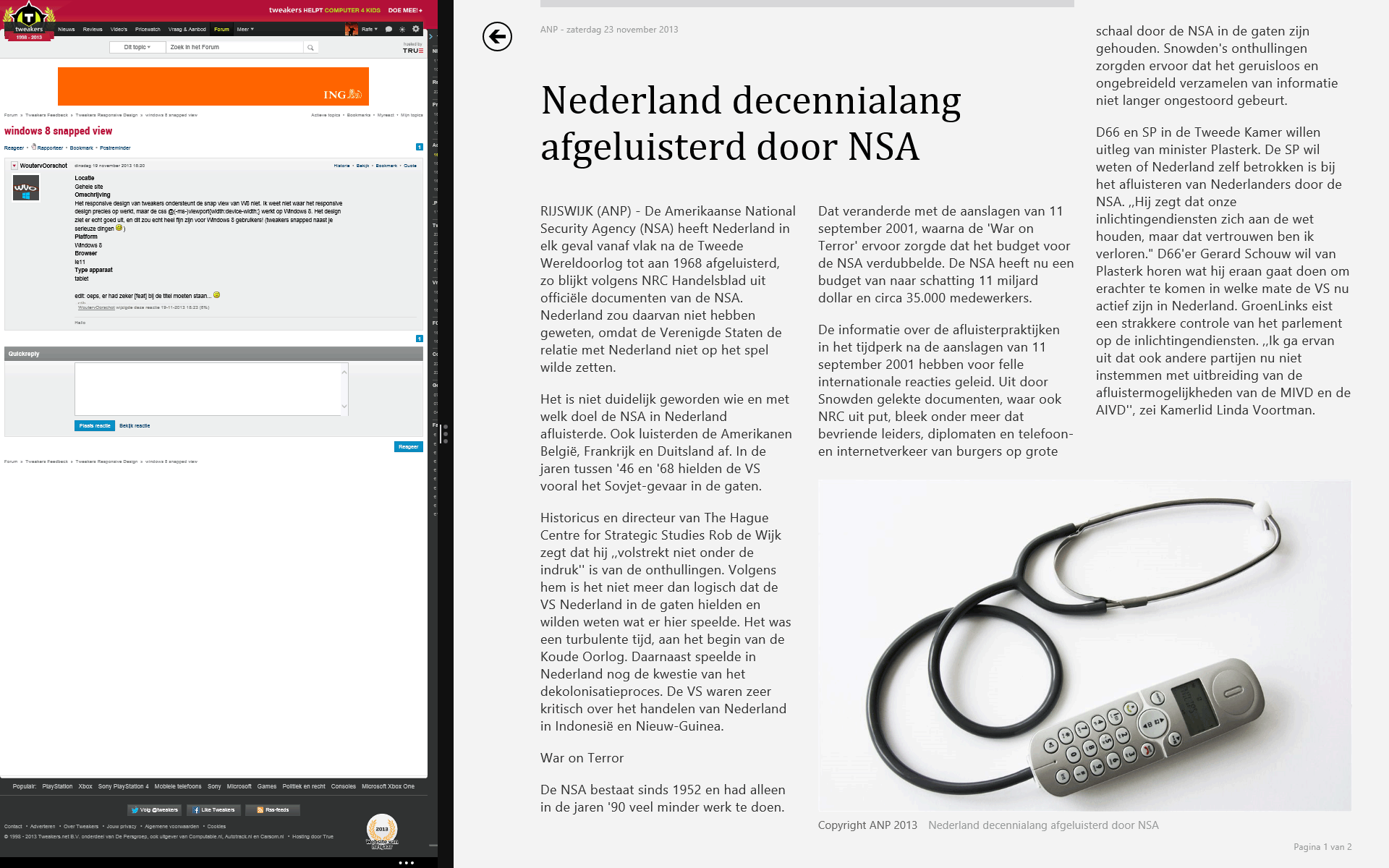 Het responsive design van tweakers ondersteunt de snap view van W8 niet. Ik weet niet waar het responsive design precies op werkt, maar de css @(-ms-)viewport{width:device-width;} werkt op Windows 8. Het design ziet er echt goed uit, en dit zou echt heel fijn zijn voor Windows 8 gebruikers! (tweakers snapped naast je serieuze dingen