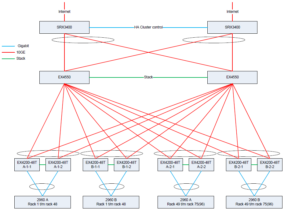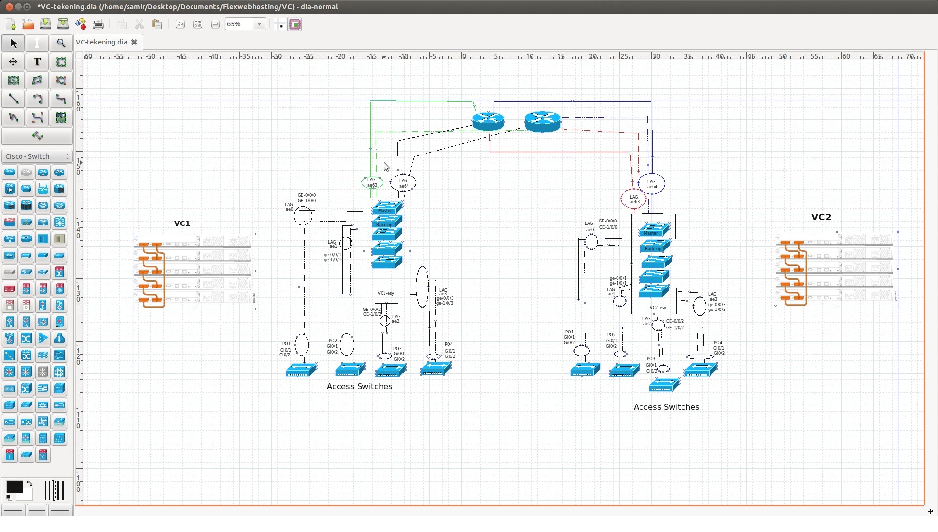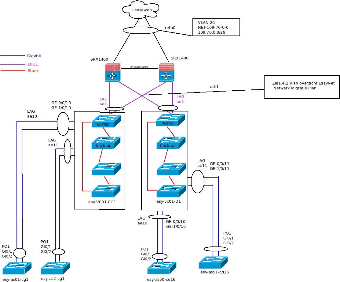 ik ben bezig met een netwerk Migratie van de heel netwerk. op dit moment wordt er 2 ex3200 als core switchs gebruikt en er zetten 150 cisco switchs als access switch aangesloten met spanning tree aangesloten. ik wil graag de access switchs in de toekomst met port channel aansluiten op de VC van de juniper. uit de ducumentie van de juniper lees ik dat het max LAG 64 is