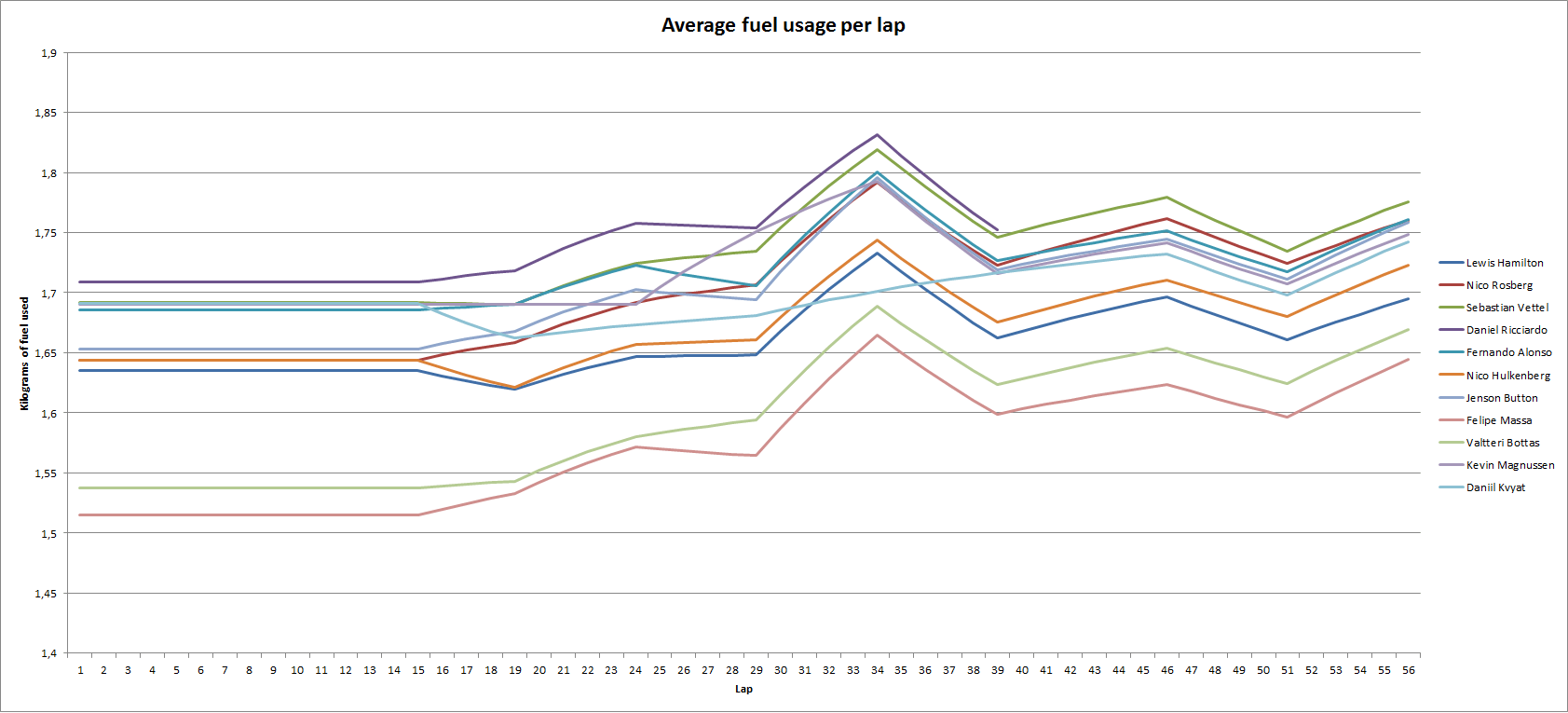 Wat opvalt is dat de Mercedes motoren van Hamilton, Bottas en Masse beduidend zuiniger zijn dan de rest. Ook is duidelijk te zien dat de Renault motoren van Ricciardo en Vettel echt op de max getunned zijn., en dat ze veel vleugel hadden staan. Vettel had nog maar een halve liter over en Ricciardo zat toen hij uitviel kwa verbruik zelfs boven Vettel.