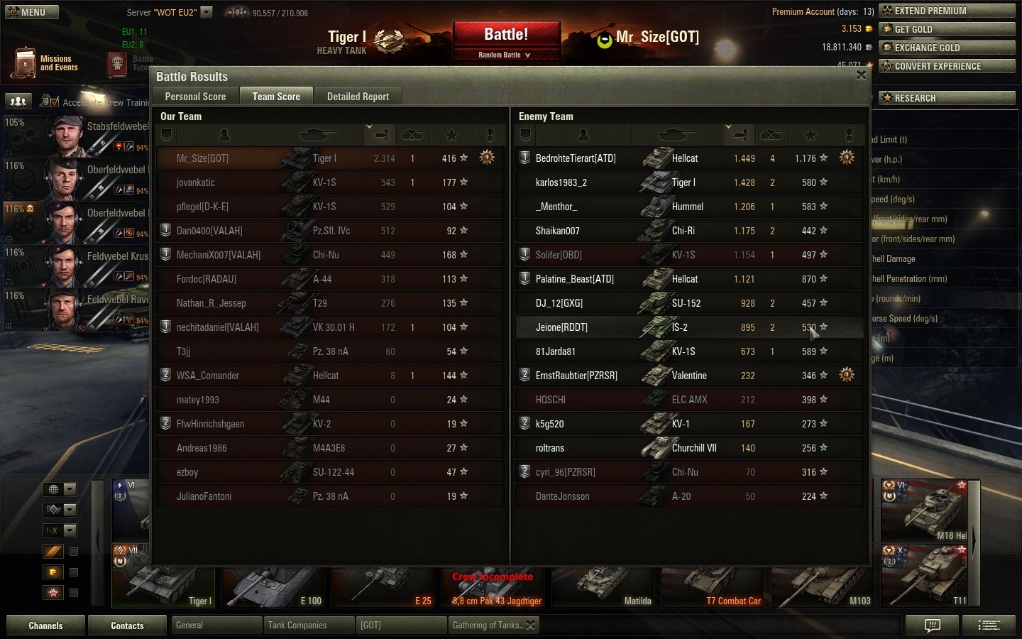 Damn, bijna 2900 XP is echt bizar. Ik snap eerlijk gezegd niet helemaal waarom je besloot naar goud te switchen, terwijl alle schoten er waarschijnlijk ook met AP doorheen waren gegaan, maar goed, als je genoeg credits hebt... Doet uiteraard niets af aan het feit dat het een geweldige pot was. Mooi om te zien hoe je op het laatst in je eentje een full health Tiger II ownde