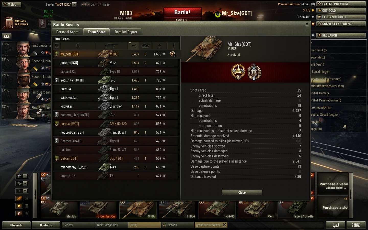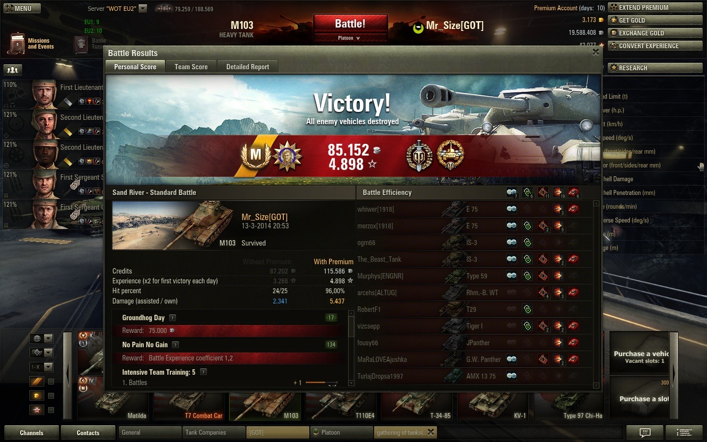 Wat een tank, het is dat ik die E5 graag wil en daar die 103 crew voor nodig heb, maar anders had ik die M103 100% gehouden. Maar ach, ik heb de Conqueror nog en die ga ik sowieso houden. Nog zo'n leuke T9 tank. Dit is momenteel wel mijn favoriete tier, vaak een stuk leuker dan met T10 tanks spelen.