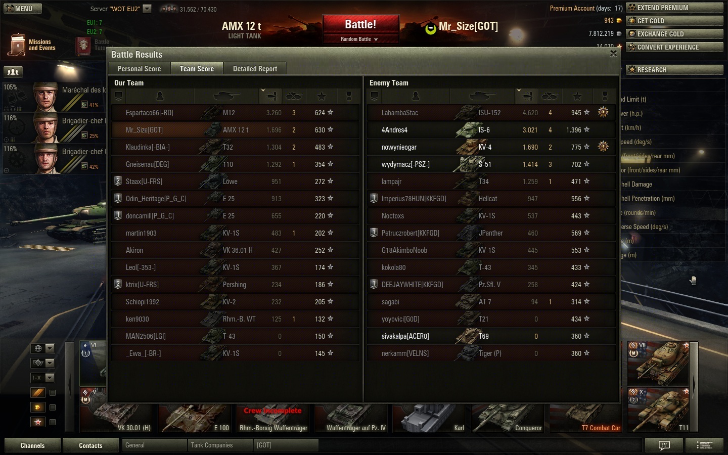 | Tank | Exp | Dmg | WN8 | WR | Battles Conq | 1.054 exp | 2.473 dmg | 3.232 WN8 | 67.9% | 193 E-100 | 969 exp | 2.944 dmg | 3.202 WN8 | 51.3% | 80 Tiger I | 950 exp | 1.640 dmg | 2.979 WN8 | 59.6% | 539 VK 3001H | 977 exp | 1.001 dmg | 2.749 WN8 | 70.0% | 10 JP E-100 | 810 exp | 2.884 dmg | 2.703 WN8 | 58.3% | 36 |