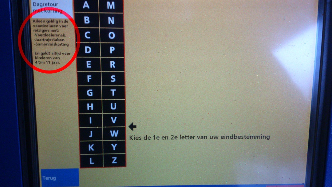 Ik kocht vanochtend een kaartje voor Roosendaal -Eindhoven (retourtje). De machine vraagt me of ik korting wil. Ik dacht dus "wie wil er nou geen korting? Doe maar dus". NA het betalen deelt de machine mee dat de korting alleen geldig is als je meereist met iemand die een OV heeft. Ik reis nooit met de trein, dus hier wist ik niks van tot het NA het betalen wordt verteld. Makkelijk geld verdienen zo.