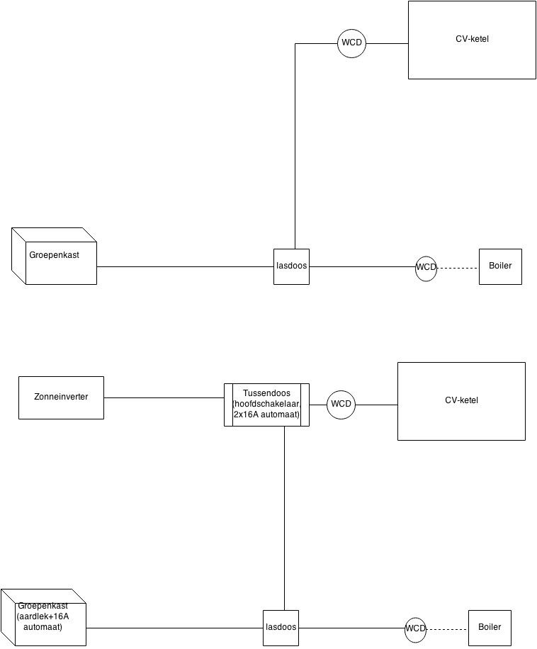Er is een uitzondering: de zogenaamde wasmachine groep. Als deze groep slechts één verbruiker heeft, de wasmachine, dan mag je een verdeling maken voor je PV door de WCD te vervangen door een klein groepenkastjes met twee automaten of ALS. De ene gaat naar een WCD voor de wasmachine, die vaak op zolder staat, de andere als vaste aansluiting naar je PV installatie. In veel "standaard" huizen is dit van toepassing.