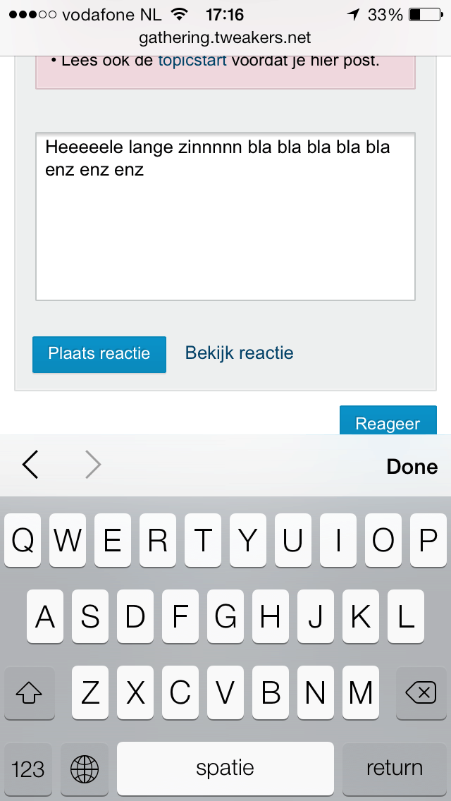 Het reactieveld in iOs7 breder dan het scherm. Als je dus op het einde van een lange zin zit, kan je niet meer terug naar links om op de reactieknop te drukken. En omdat je niet kan zoomen ofzo, moet je gaan klooien om terug te komen. Neem aan dat een screenshot overbodig is.