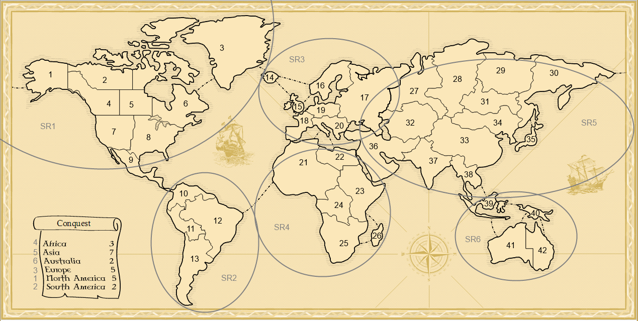 • Bottlenecks (Zuid-Amerika <-> Zuid-Afrika, Nieuw-Zeeland <-> Azië, Groenland <-> IJsland, ...) herkennen en verdedigen, en doodlopende wegen (Zuid-Amerika, Zuid-Afrika, Australië) herkennen en fanatieker de legers laten laten verplaatsen.