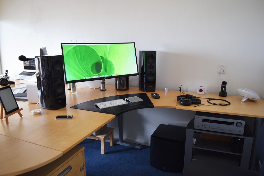 Verder zie je nog een Logitech LS21 2.1 speakersetje dat is aangesloten op het beeldscherm voor gebruik met de XBOX One (die niet op de foto staat, maar rechts van de laptop) en een Bose Soundlink Mini II die via Bluetooth is verbonden met de iPhone, iPad of MacBook.