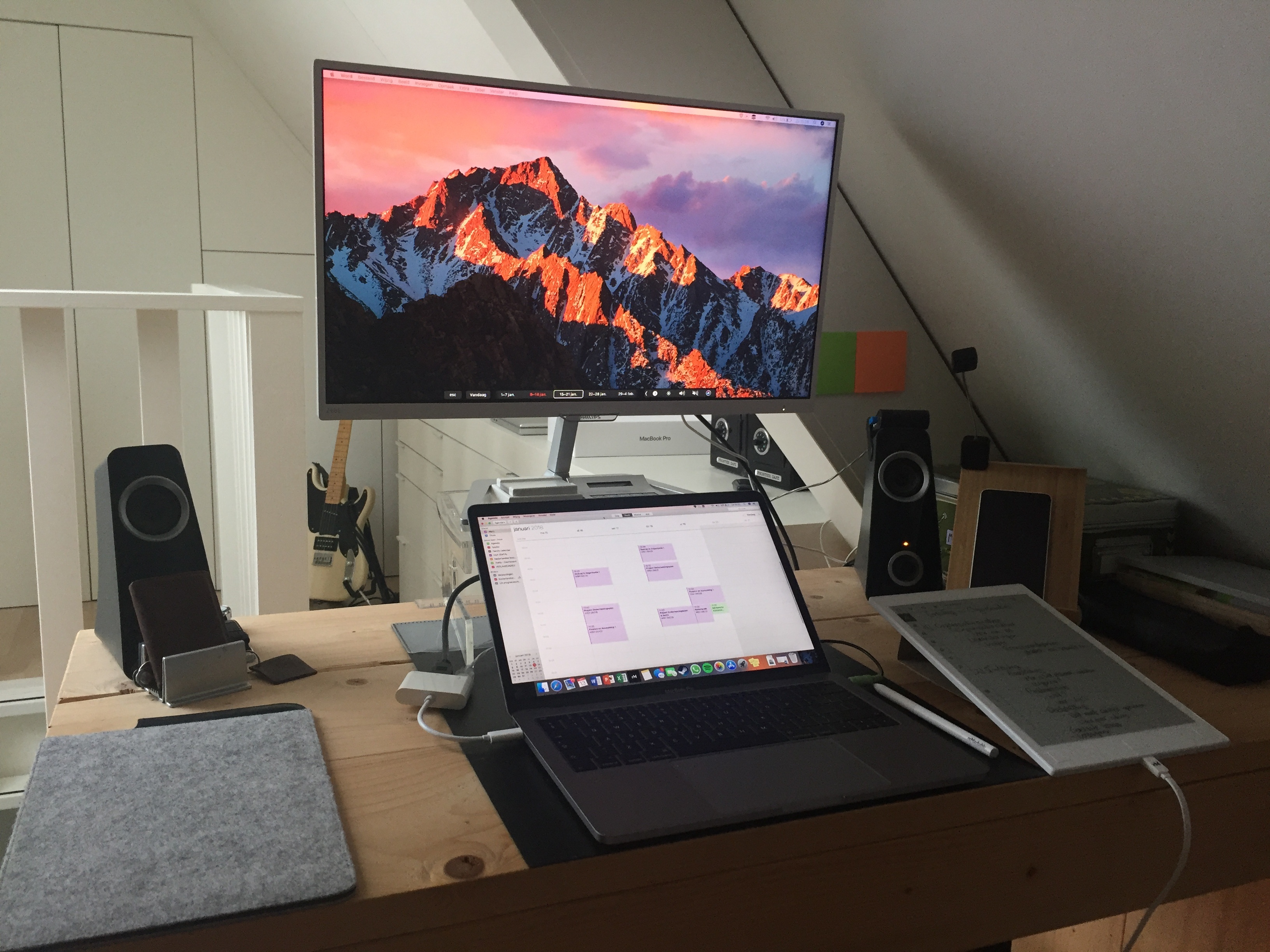 Rechts van m'n MacBook de reMarkable Paper Tablet (tip: fantastisch ding) waardoor ik eigenlijk op drie verschillende schermen kan werken.