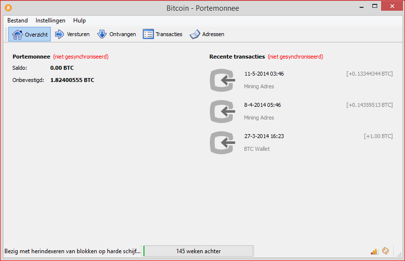 Toen ik net mijn wallet (Bitcoin-Qt v4.8.3.) wou openen om 'm te laten synchroniseren lukte het ineens niet. Kreeg een foutmelding dat de synchronisatie was mislukt en het programma sloot zichzelf. Daarna voor een tweede keer geprobeerd om 'm te openen waarbij ik nogmaals een foutmelding kreeg met het verzoek om iets te doen of abort. Dat eerste had ik niet goed doorgenomen (stupid) maar nu is de app bezig met het "herindexeren van blokken op harde schijf":