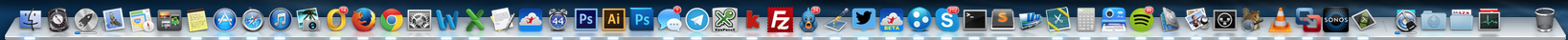 Finder,Launchpad, Mail, Calendar, Notes, Messages, Lync, Spotify, iTunes, LastFM, Chrome, Safari, Mendely, Word, Powerpoint, iPhoto, Photoshop, Illustrator, Indesign, Premiere Pro, Tweetdeck, Contacts, iBooks en de download folder en een andere folder naast de trashcan.