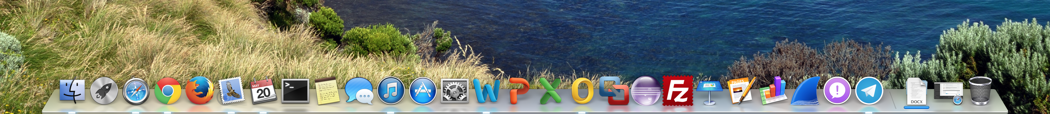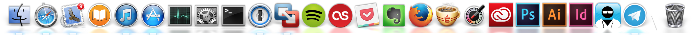 Finder, Safari, Mail, iBooks, iTunes, App Store, Activity Monitor, System Preferences, Terminal, 1Password 4, VMware Fusion, Spotify, Last.fm, Pocket, Evernote, Firefox, Espresso, DigitalColor Meter, Creative Cloud, Photoshop, Illustrator, InDesign, swackett X, Messenger for Telegram