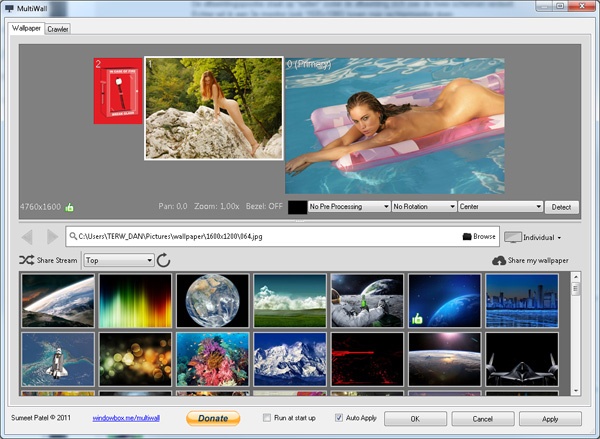 Ik heb drie monitoren, twee naast elkaar en een boven de rechtermonitor. De twee onderste monitoren moeten een achtergrond van 3840x1080 hebben, de andere een 1920x1080. Hoe kan ik dit doen?