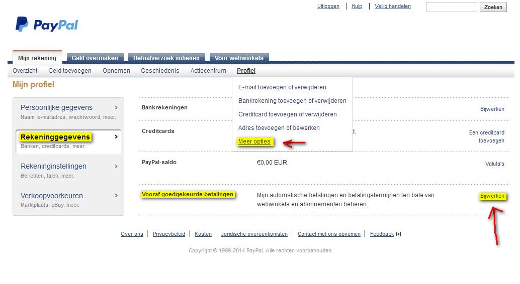 Eerst op "Profiel" klikken en daarna op "Meer Opties", dan zie je als je Rekeninggegevens aanklikt het veld met "Vooraf Goedgekeurde Betalingen" daarna klikken op bijwerken.