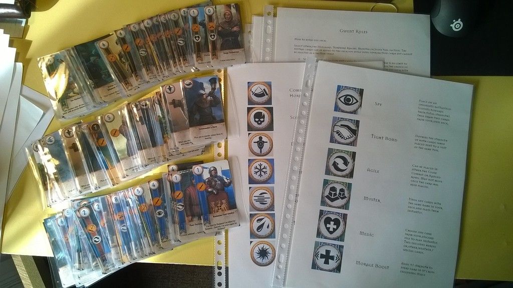 Ik heb een paar weken geleden zelf de Gwent kaarten gemaakt om samen met vrienden te kunnen spelen. Elk deck heb ik 2 keer geprint met de tight bond kaarten 2 keer per deck en alle overige kaarten een keer. Voor weather effects en specials zoals decoys bepalen we per game hoeveel je er in je deck mag stoppen (ook bv max 2 spies anders is Nilfgaard flink OP). Tot nu toe al heel wat uurtjes zoet mee geweest al kostte het een potje of 10 om alle regels goed te stroomlijnen.