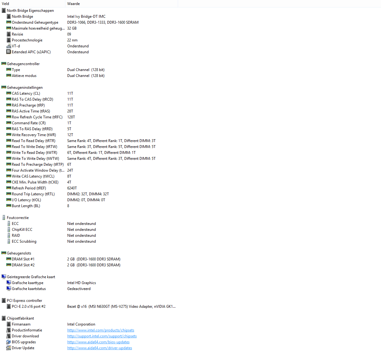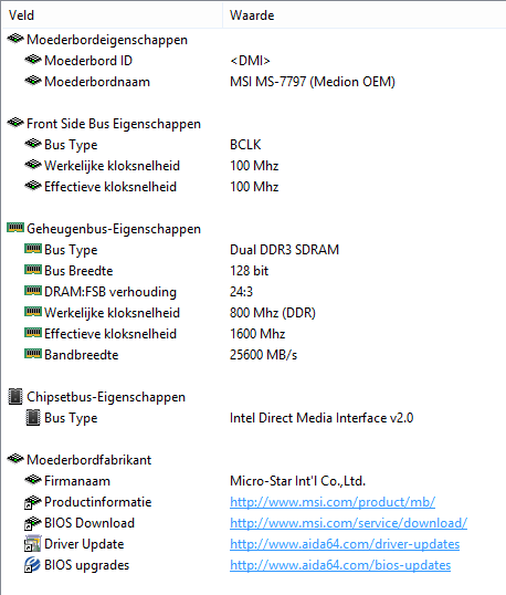 Maar ik heb ook gekeken met AIDA64 naar mijn computer specs, geheugen, chipset en moederbord en hier drie afbeeldingen daarvan: