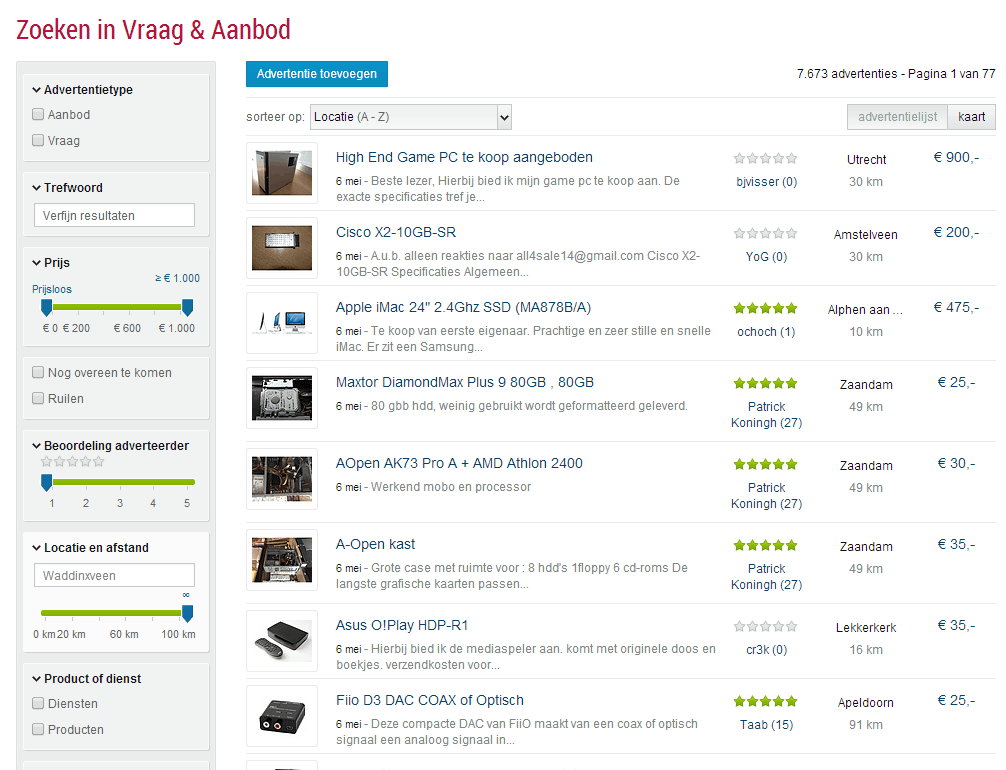 Dan geef je de locatie op waar je je bevind en een maximum afstand, dan krijg je prima alle advertenties in de buurt te zienbbblije schreef op maandag 25 augustus 2014 @ 13:23: