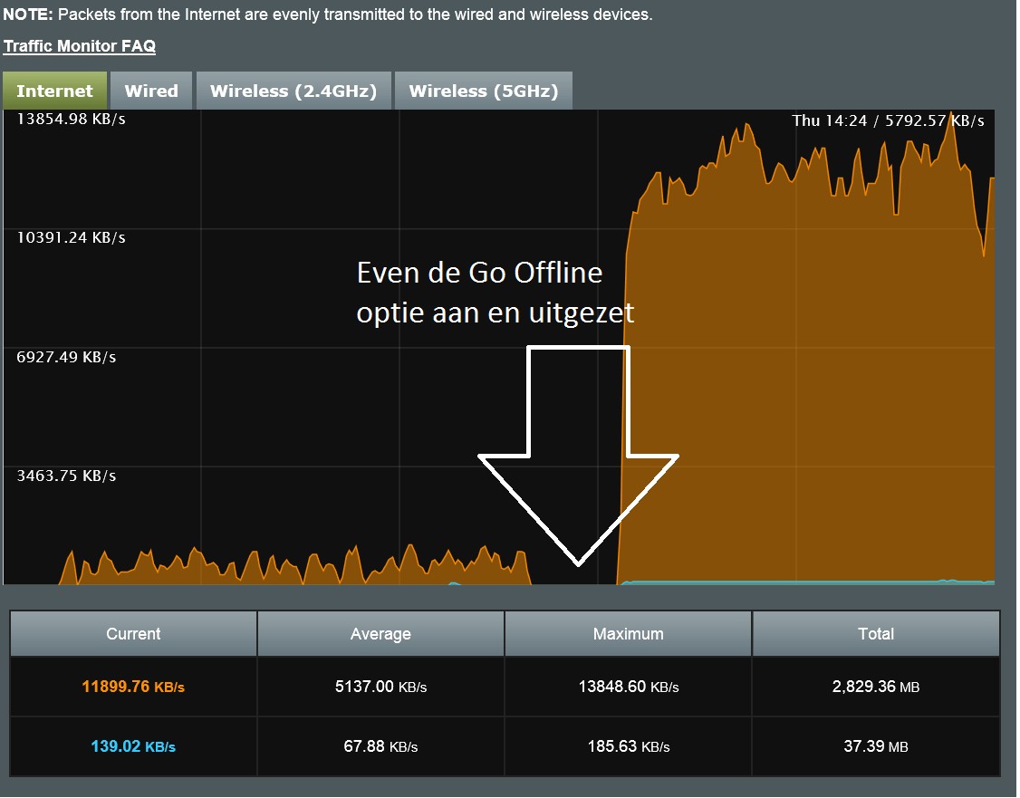 Nou het ging even goed met UPNP en DMZ en Portforwarding aan, maar na verloop van tijd zakte de snelheid weer in naaar een 3-8mbit/s. Dus de Go offline optie aangezet en een minuutje gewacht. Daarna weer online gegaan en toen schoot direct de download weer omhoog. Erg vaag dit zeg: