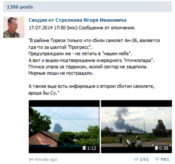 Aldus één van de chiefs van de Russische separatisten: Igor Strelkov. Link naar VK.com: http://vk.com/strelkov_info?w=wall-57424472_7256.Near by Torez, just right now the plane an-26 was shoot down. He is laying near be mine "Progress"