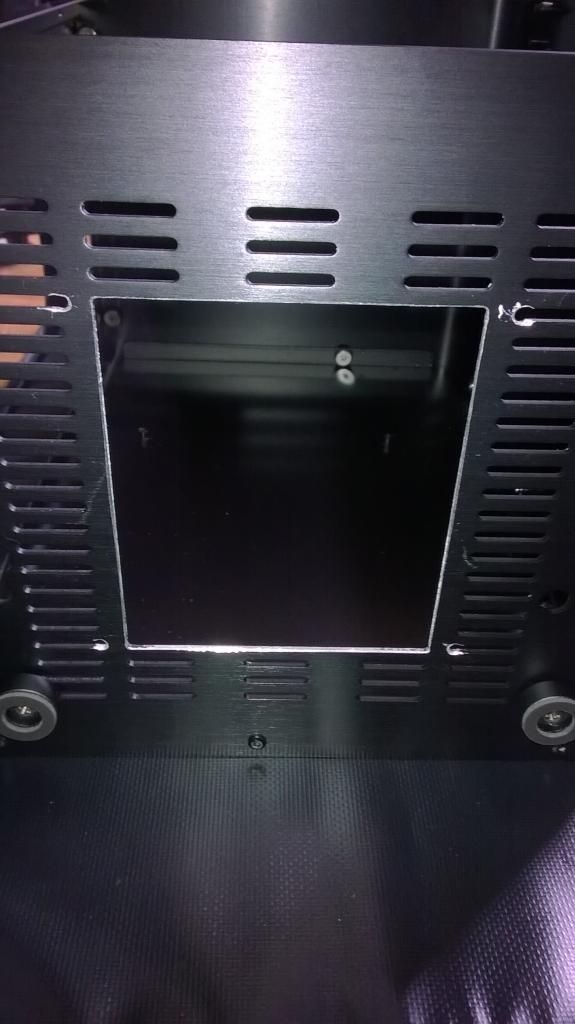 Dat is de plek waar normaal de intake fan zit. De intake fan wordt verplaatst naar de bodem. Hoewel daar wel een rooster zat, wil ik het liever wat meer open, dus de dremel er in. Iets wat me eigenlijk gelijk een beetje tegenviel aan het kastje waren de voetjes, deze vond ik buiten proportioneel. Gelukkig had ik nog wat voetjes van een Nexus Psile liggen, welke door ze op te boren en te voorzien van HDD demp rubbers perfect paste bij dit kastje.